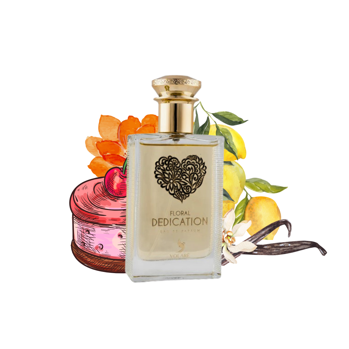Floral Dedication by Volare is a captivating 100ml unisex fragrance that opens with a burst of zesty candied lemon, delivering a sweet and vibrant introduction. As the scent unfolds, delicate notes of creamy panna cotta blend with the floral elegance of orange blossom, while a hint of rum adds an unexpected warmth and depth. The fragrance lingers with a comforting base of rich vanilla, creating a harmonious balance between sweetness and sophistication. Perfect for those who appreciate a fragrance that is both playful and refined, Floral Dedication is a versatile scent for any occasion.
