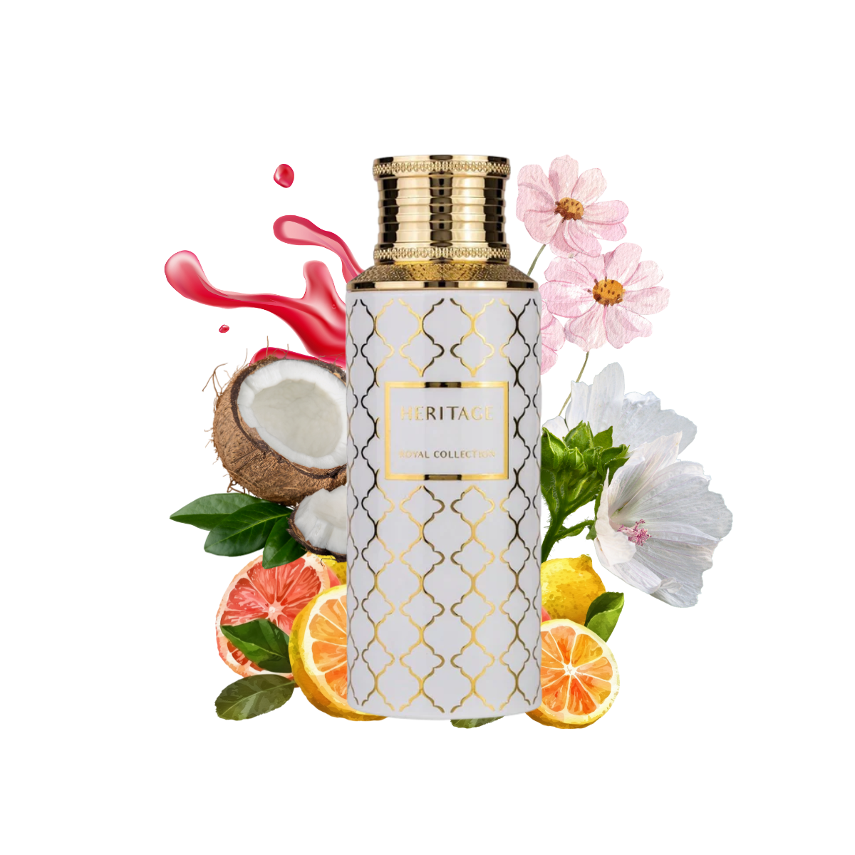 Heritage is an exquisite fragrance that takes you on a sensory journey with its unique notes. The opening of Fresh Citrusy notes and delicate Floral notes blend perfectly with heart notes of Coconut and exotic Fruits, leading to a base of Musky and Sweet notes. Elevate your senses and immerse yourself in opulence with this remarkable fragrance.