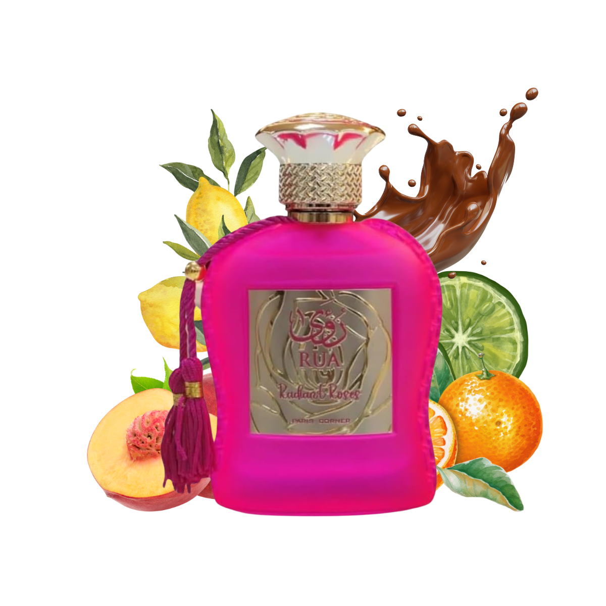 RUA RADIANT ROSES opens with a dazzling burst of freshness. The zesty brightness of bergamot and lemon is softened by the juicy sweetness of peach, while a hint of chocolate adds a touch of indulgence. The fresh citrus elements create a lively and invigorating top note that is both vibrant and irresistible.